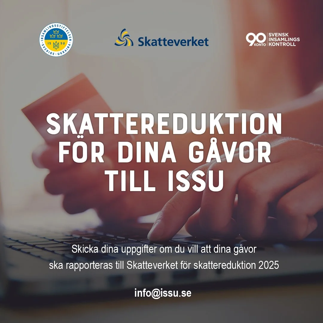 Från och med 16 december 2025 är Insamlingsstiftelsen Sverige-Ukraina (ISSU) godkänd av Skatteverket som gåvomottagare. Det innebär att du som givare nu kan få skattereduktion för dina bidrag till vår verksamhet. Skattereduktionen gäller alla typer av gåvor – månadsgåvor, engångsgåvor och donationer via Swish.